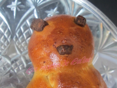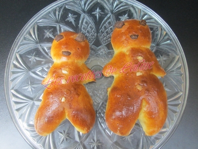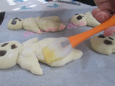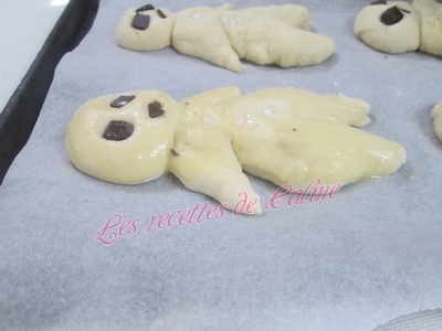 À l’aide des pépites de chocolat (si vous n’avez pas de pépites de chocolat, prenez des carrés de chocolat que vous concassez grossièrement afin de faire les yeux et 3 petits boutons, pour les petits boutons, vous pouvez aussi utiliser des grains de sucre à chouquettes), faites les yeux, et décorer votre mannele comme vous le souhaitez. Couvrir la plaque d’un linge humide et laissez-les lever encore une demie heure (ils doivent à nouveau doubler de volume). ATTENTION : espacez-les bien, car s’ils sont trop près les uns des autres sur la plaque, ils risquent de coller entre
