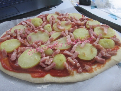 Eplucher et couper les pommes de terre en fines rondelles,déposez-les sur la sauce tomates. Ajoutez les lardons, l’échalote.