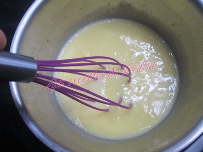 Faites cuire sur feu doux durant 5 min environ en remuant de façon régulière. Faites attention de bien remuer avec le fouet dans tous les recoins de la casserole de façon à avoir une cuisson homogène.