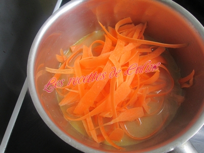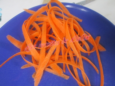 Éplucher les carottes et les détailler en tagliatelles à l’aide d’un économe.