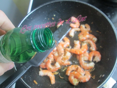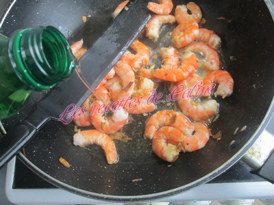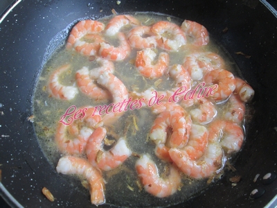 Dans une cocotte, faire chauffer l’huile d’olive et faire revenir les échalotes. Ajouter les crevettes et les faire bien suer à feu vif.