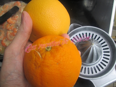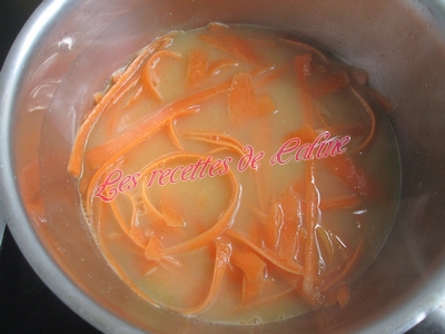 Dans une casserole, verser le fumet obtenu, ajouter le jus du pomélo, le jus d’orange ainsi que le gingembre et les tagliatelles de carottes, puis laisser frémir 7 min.