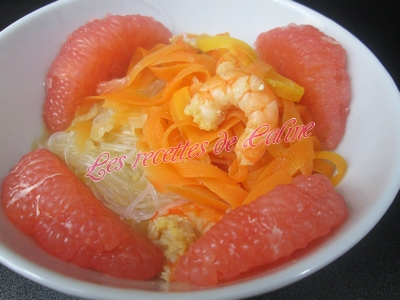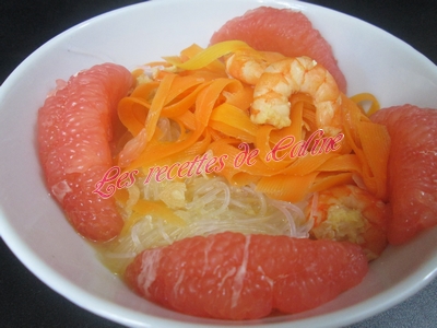Répartir le vermicelle, les crevettes et les carottes dans les bols, couvrir de bouillon et mettre les quartiers de pamplemousses que vous aviez réservé.
