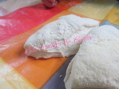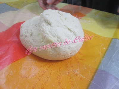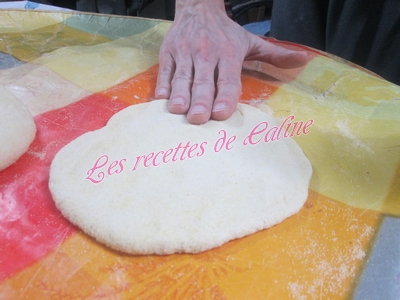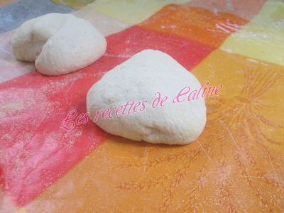 Déposer chaque boule sur un coin de votre plan de travail, couvrir d’un linge et laisser reposer 15 min. Aplatir chaque boule assez finement sans oublier de mettre un peu de semoule, ça évite que sa colle.