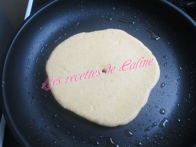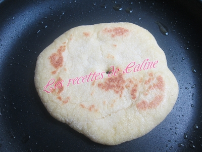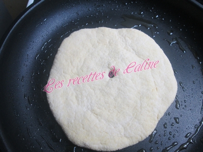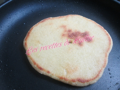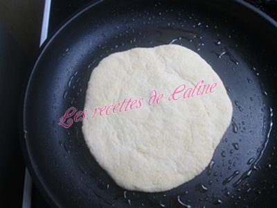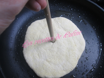 Y déposer une galette et faire un petit trou au centre pour aérer la pâte et faire cuire de chaque côté, si les pains restent blancs sur les côtés il vous suffit de les aplatir un peu avec les mains ou avec une spatule.