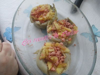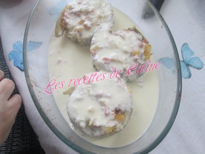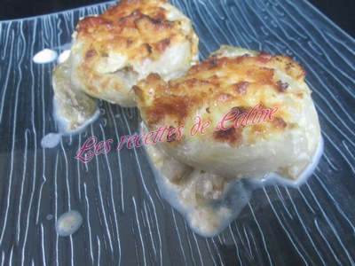 Couper les endives en deux dans le sens de la longueur et les garnir avec la farce pommes/jambon (pour ma part, je les ai fait dans des emporte-pièces)