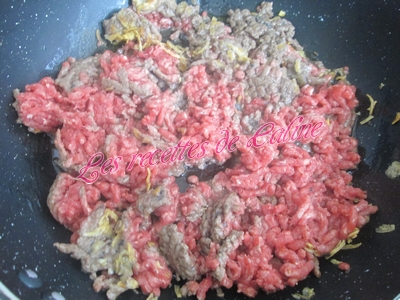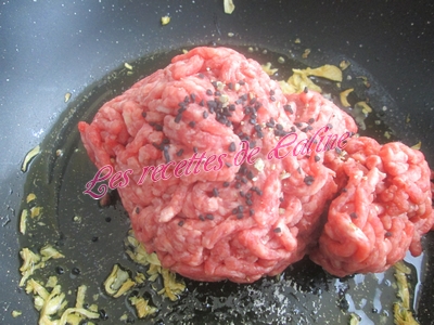 Faire rissoler l’oignon émincé dans l’huile d’olive et rajouter la viande hachée, saler, poivrer.
