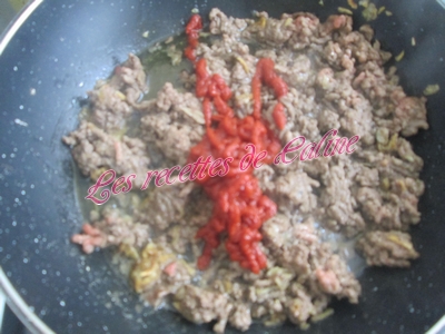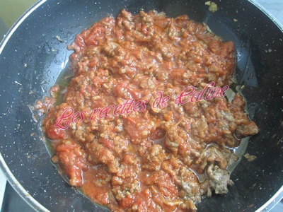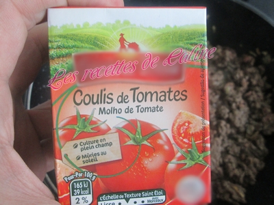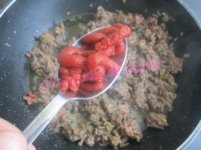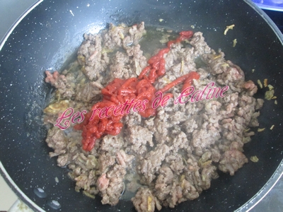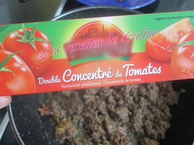 Une fois que la viande est cuite, ajouter le cumin, le concentré de tomate puis la brique de sauce tomates et laisser mijoter quelques temps : il ne faut pas que la sauce soit trop liquide.