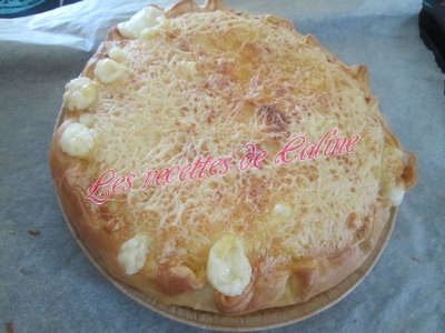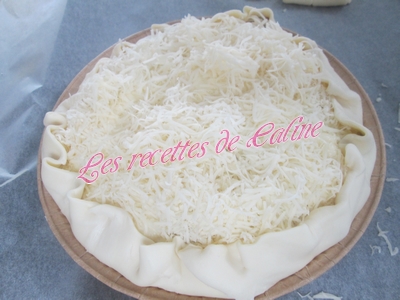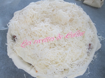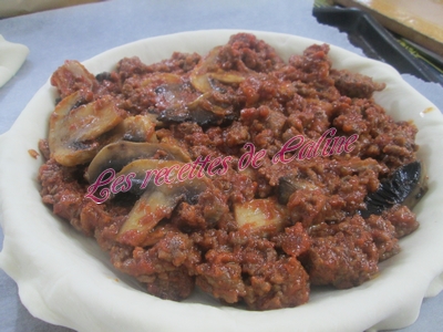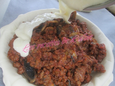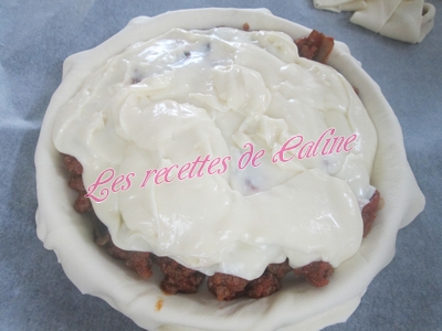 Etaler la sauce (viande) sur la pâte, rajouter la béchamel et le gruyère râpé, rabattre les bords de la pâte vers le centre de la tarte, cela évitera que la préparation ne coule à la cuisson (voir dernière photo).