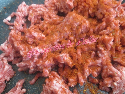 Faire revenir la viande hachée dans une poêle et assaisonner avec les épices de votre choix. Réserver.