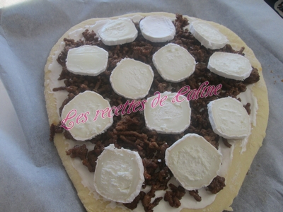 Couper le fromage de chèvre en tranches et répartissez-les partout sur la pâte