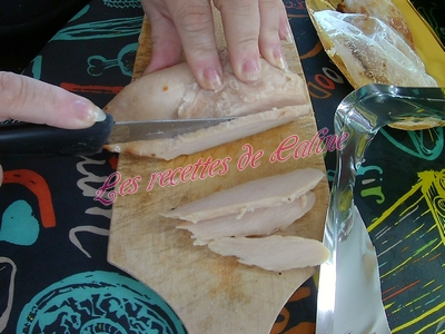 Si vous n’avez pas de poulet froid, vous pouvez utiliser des escalopes de poulet que vous ferez cuire au préalable, les laisser refroidir puis les couper en lamelles