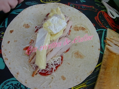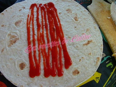 Sur une tortillas (ou galette de blé ou maïs) mettre le ketchup ou sauce Sriracha