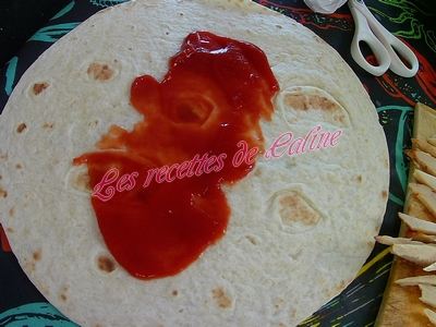 Sur une tortillas (ou galette de blé ou maïs) mettre le ketchup ou sauce Sriracha