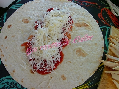 Déposer sur la sauce le fromage râpé, ensuite déposer des lamelles de poulet.