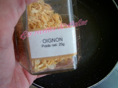 Emincer finement l’oignon(pour ma part, ‘utilise de l’oignon séché, donc je passe à l’étape suivante) et faites-le blondir dans la poêle.