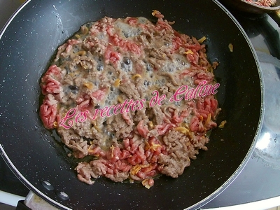 Ajouter le boeuf sur feu vif jusqu’à complète évaporation du jus de cuisson et remuez très régulièrement avec une cuillère en bois afin d’éviter à la viande ne colle