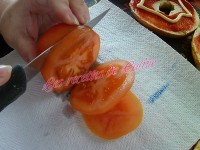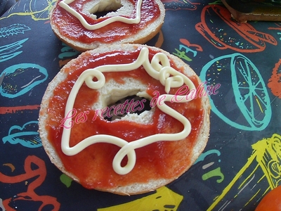 Badigeonner les petits pains de ketchup et de mayonnaise puis y déposer de fines lamelles d’oignons.