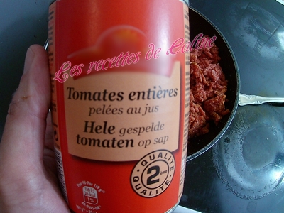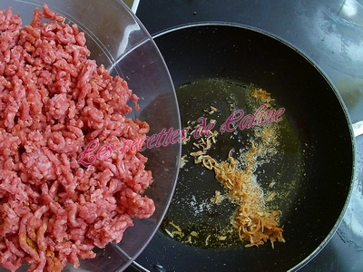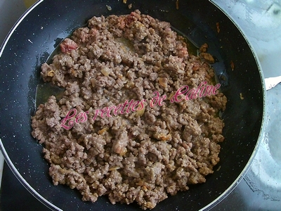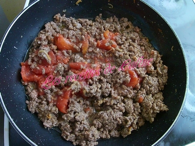 Ajouter le boeuf haché et faire cuire, puis ajouter les tomates pelées avec la moitié du jus (garder l’autre moitié si nécessaire).