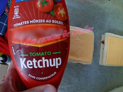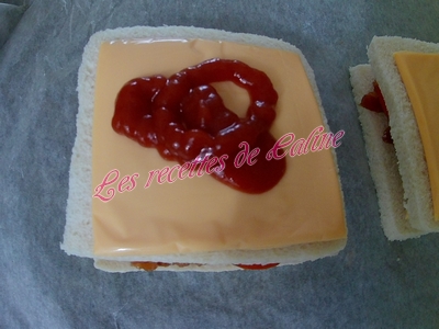 Recouvrez de tranches de pain, et garnissez-les ensuite de cheddar, ketchup (ou sauce Sriracha) puis de poulet.
