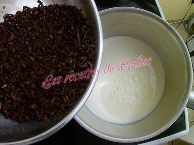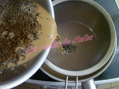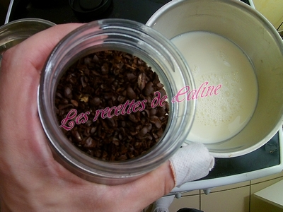 Mettre dans les 40 cl de lait bouillant, verser les 40 g de grains de café moulu. Laisser infuser à couvert pendant trente minutes. Passer.