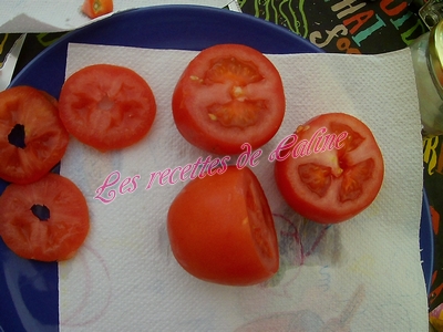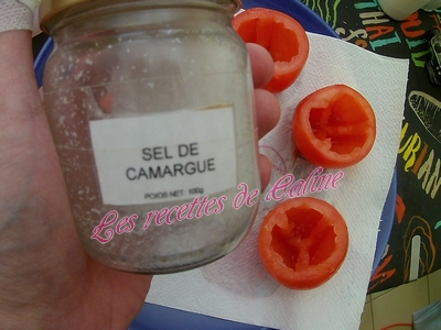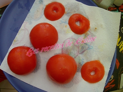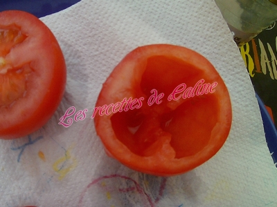 Coupez et réserver le chapeau des tomates. A l’aide d’une cuillère parisienne, les évider. Faire dégorger les tomates : Saler l’intérieur et les retourner sur du papier absorbant.