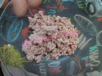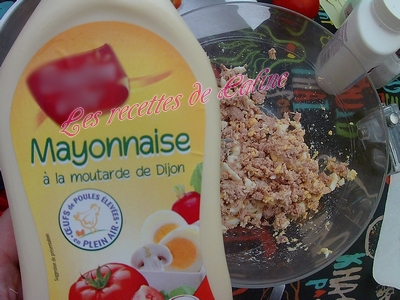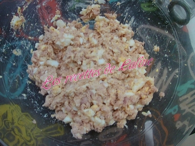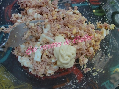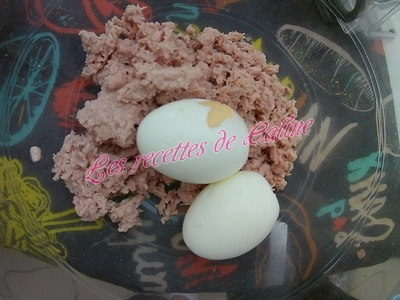 Écraser 2 oeufs durs(les 2 autres oeufs serviront pour accompagner dans l’assiette) avec le thon et la mayonnaise. Salez, poivrez et Bien mélanger.