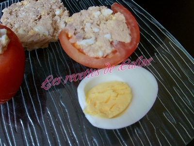 Remplir chaque tomate de la farce et déposer le chapeau. Réserver au réfrigérateur juqu’au moment de servir, accompagné du second oeuf dur.