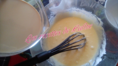 Séparer les blancs et les jaunes d’oeufs. Fouettez les jaunes d’oeufs et le sucre. Ajoutez le beurre fondu et mélangez. Ajoutez ensuite la farine, puis le lait au café, en plusieurs fois. Mélangez pour obtenir une