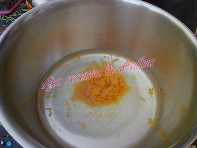 Mettre le zeste dans une casserole, ajouter un verre d’eau et le sucre glacé.
