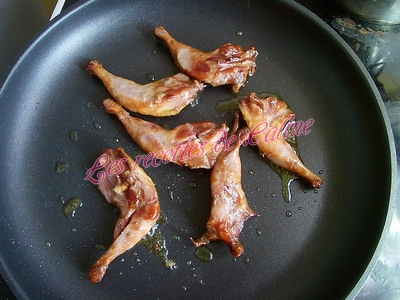 Dans une poêle antiadhésive (Diamant Store), faites rissoler les petites cuisses de caille avec 1 cuil d’huile, du sel et du poivre (je n’ai pas assaisonner mes petites cuisses car comme elles avaient été cuisiner par les soins de mon partenaire Feyel, j’ai préféré ne rien mettre quitte a assaisonner dans mon assiette si nécessaire). Réserver sur une assiette