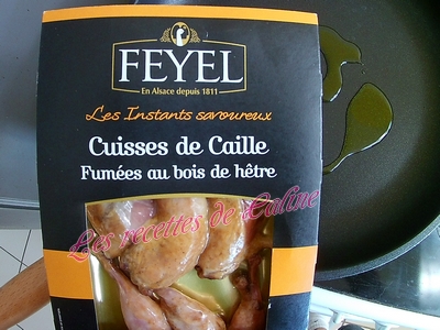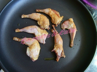 Dans une poêle antiadhésive (Diamant Store), faites rissoler les petites cuisses de caille avec 1 cuil d’huile, du sel et du poivre (je n’ai pas assaisonner mes petites cuisses car comme elles avaient été cuisiner par les soins de mon partenaire Feyel, j’ai préféré ne rien mettre quitte a assaisonner dans mon assiette si nécessaire). Réserver sur une assiette