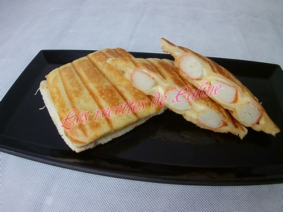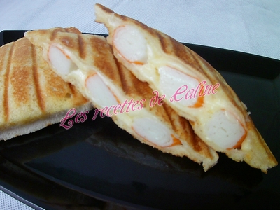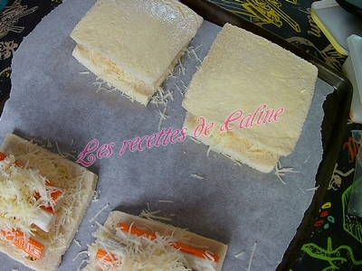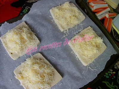 puis trois surimi et pour finir remettre un peu de gruyère, remettre une tranche de pain de mie beurré par dessus.