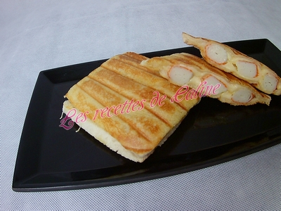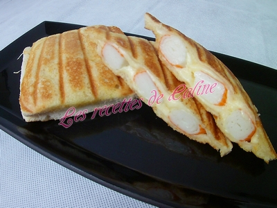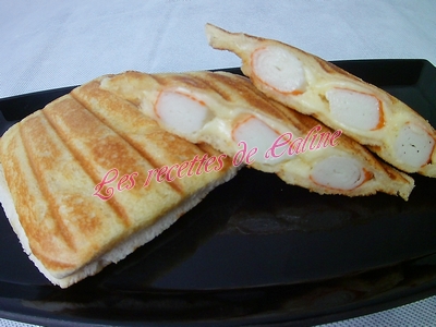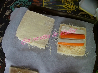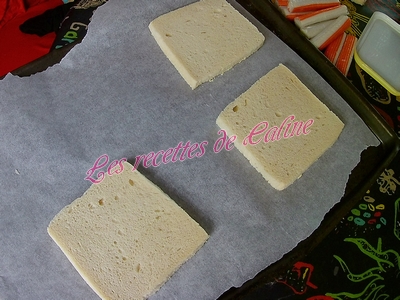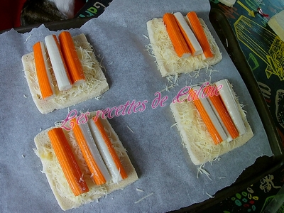 puis trois surimi et pour finir remettre un peu de gruyère, remettre une tranche de pain de mie beurré par dessus.