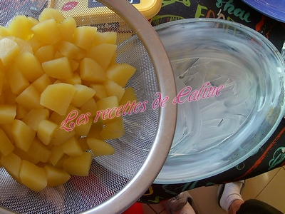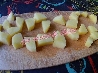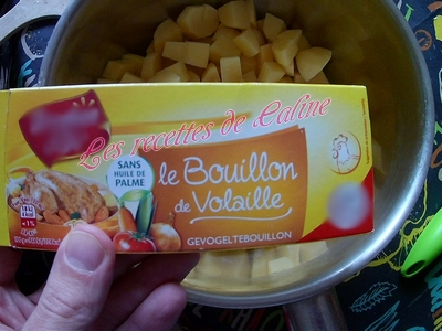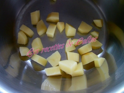 Peler et couper les pommes de terre en dés. Les faire cuire 10 min dans de l’eau bouillante avec 1 cube de bouillon de volailles.