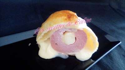 Déposer le cervelas sur la béchamel et badigeonner la viande avec de la sauce, puis l’enfermer dans la pâte.