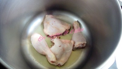 Faire revenir les cuisses de poulet (pour ma part, je les ai coupé en deux) dans la cocotte à l’huile d’olive, les retirer et y mettre tous les légumes à revenir.