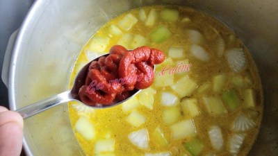 Couvrir d’eau, ajouter le safran, le Ras El Hanout, le sel, l’oignon, le poulet, le concentré de tomates et les tomates pelées avec leur jus.