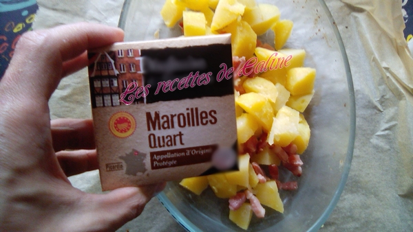 Couper des petits cubes de Maroilles et les disposer sur la 1ere couche de pommes de terre
