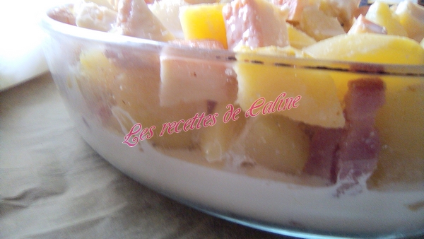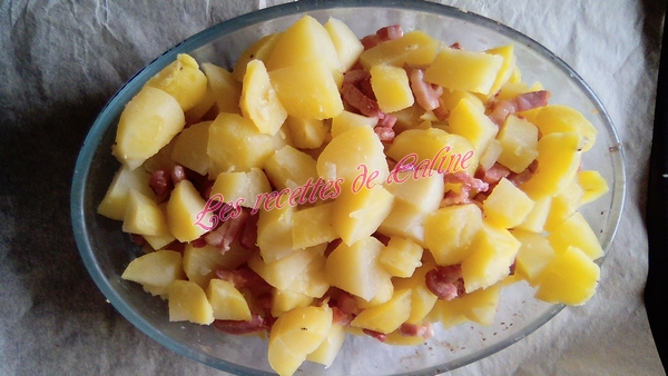 Disposer une partie des pommes de terre, des oignons et des lardons dans un plat à gratin.