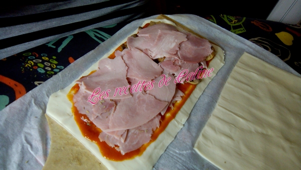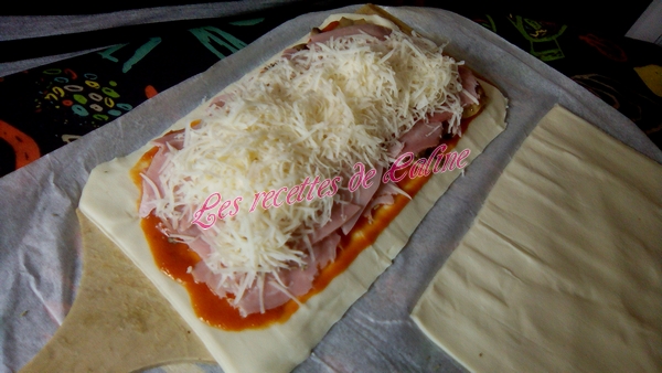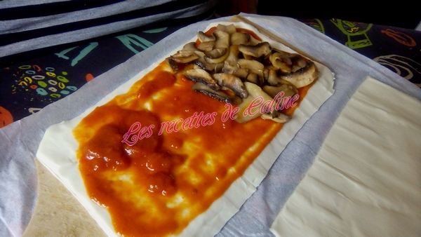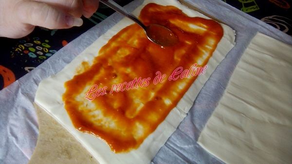Étaler le coulis de tomates sur l’un des deux morceaux de pâte (attention ne pas trop en mettre sinon à la cuisson ça va déborder de tout les côtés)