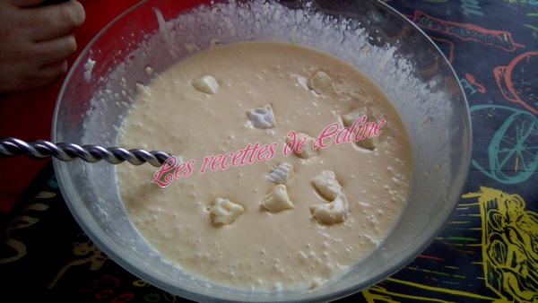 Ajouter ensuite les oeufs, puis le beurre fondu et le lait, bien mélanger.