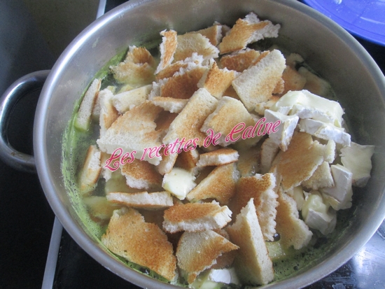 Pendant ce temps, faire bien toaster les tranches de pain, les couper grossièrement, et couper le fromage en morceaux