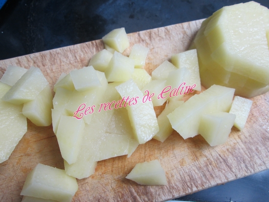 Eplucher les carottes et pommes de terre, couper les carottes en fines lamelles et les pommes de terre en petits cubes