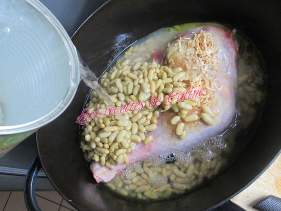 Ajouter l’oignon, les flageolets et leur jus, mettre une boîte d’eau, l’ail, le thym et le laurier