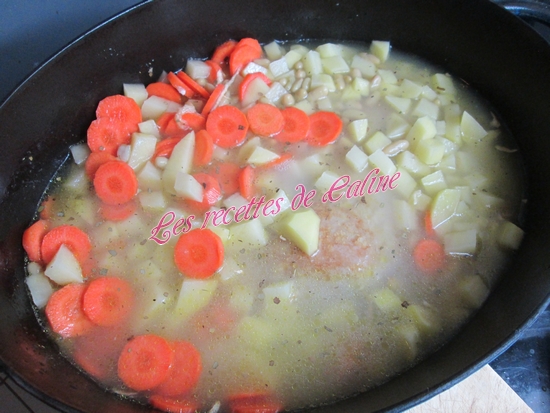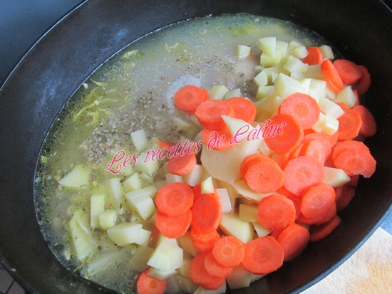 Ajouter les carottes, les pommes de terre, saler et poivrer et laisser cuire au minimum 1 h 30