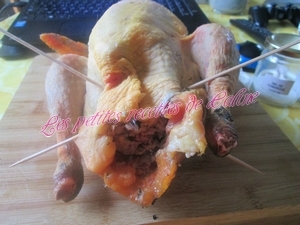 Farcissez la pintade à la petite cuillère. Fermez-la avec 2 piques à brochettes et ficelez-la.