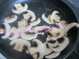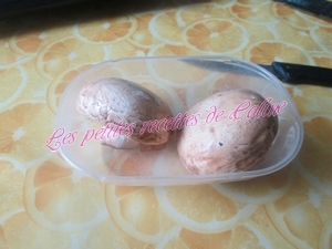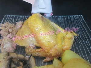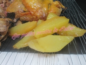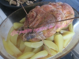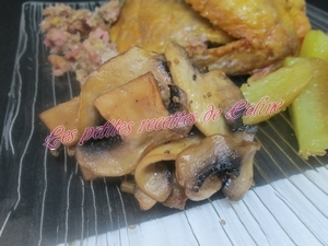 Accompagnez de quartiers de pommes de terre que vous aurez mis autour de la pintade, j’ai fait cuire mes quartiers de pommes avant à l’eau et 15 à 20 min avant la fin de la cuisson de la pintade, je les ai placé autour et remis au four, j’ai accompagné aussi ma pintade d’une bonne poêlée de champignons (de Paris pour ma part)