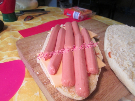 Etaler 2 toastinettes et poser 2 à 3 saucisses (de façon a ce que les saucisses tiennent mieux à la cuisson, je les ai coupé en deux dans le sens de la longueur).