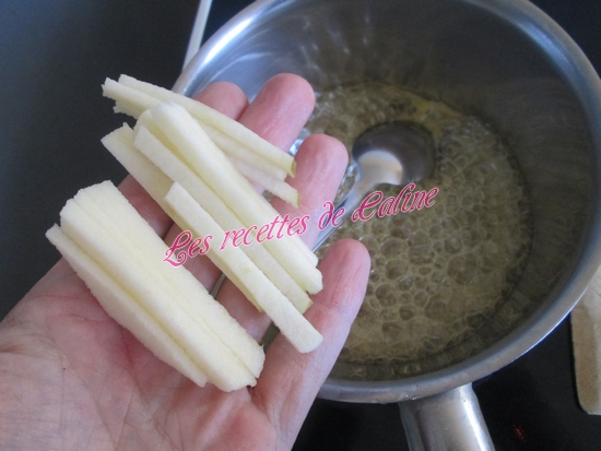 Eplucher et tailler la pomme en julienne et versez-les avec le miel et le thym, réserver.